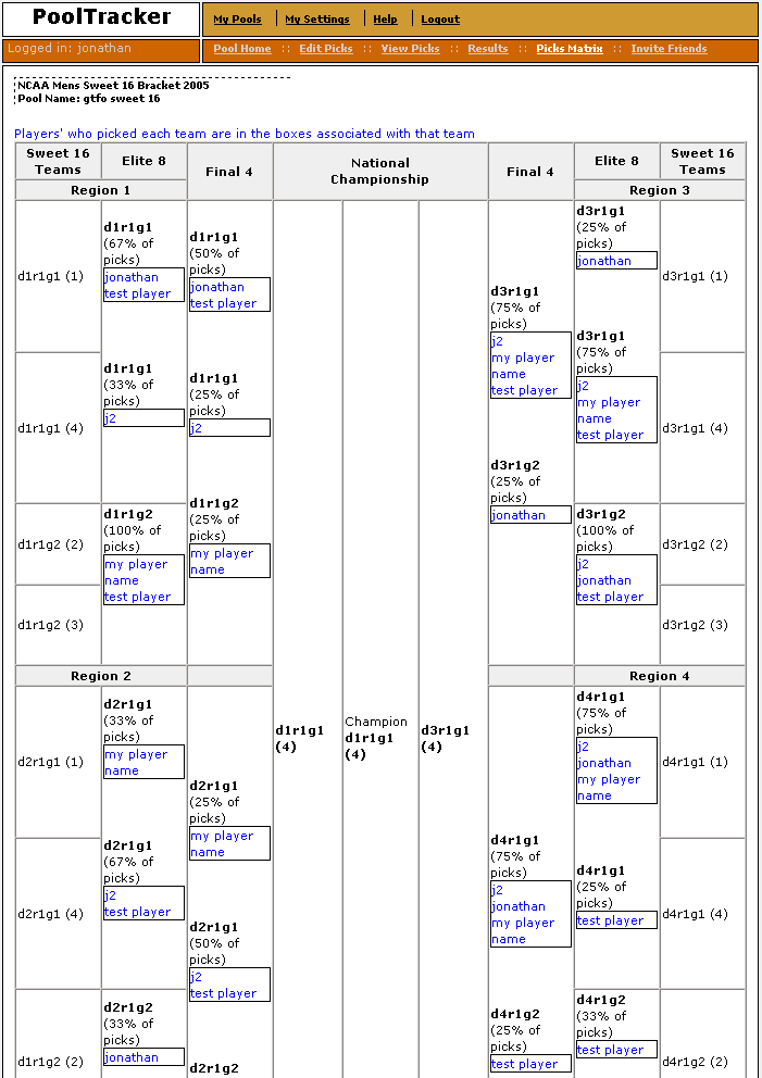 Similar to our classic style march madness bracket pool, but, for the sweet 16. All 15 picks to all remaining 15 games must be made before the tip-off of the first game in the round of 16.