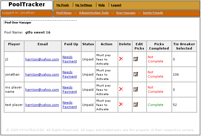 Administrator's User Manager Screen (Click to view full image) Allows the pool administrator to see everyone's progress in enterring their picks. Administrators can activate, inactivate and delete players and edit players' picks.