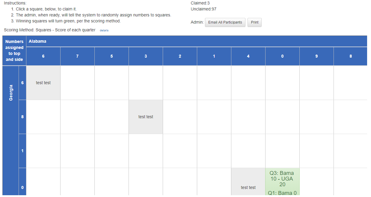 Our squares template follows standard football squares rules. You have your choice of 2 scoring methods: